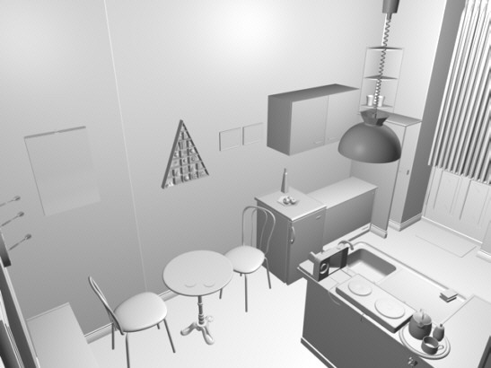 Zweite Gesamtansicht. Eine von vier Kameras,die im obersten Winkel einer Zimmereckepostiert sind. Blickrichtung Eckregal