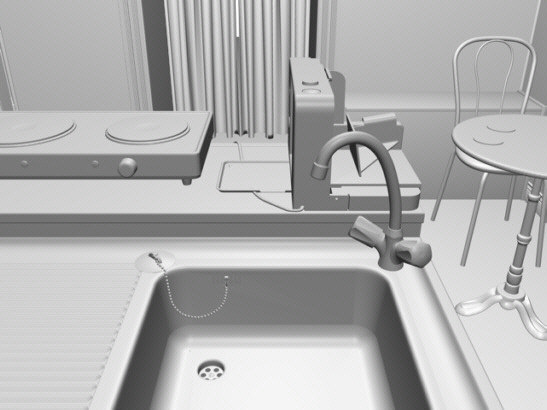 Spülbecken, Brotschneidemaschine undeine Doppelkochplatte. Hinten sieht man denDurchgang zum Wohnzimmer.
